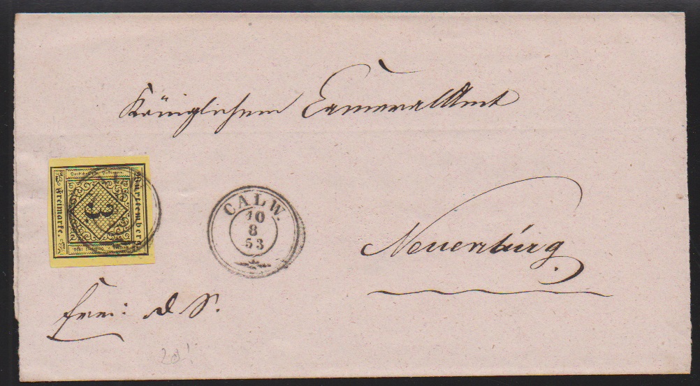 3 Kr. schw./dunkelgelb, teils sehr breitrandiges Kabinettstück auf Brief (wie oft ohne Seitenklappen) mit K2 "Calw", sign. Thoma. Mi. 280,-