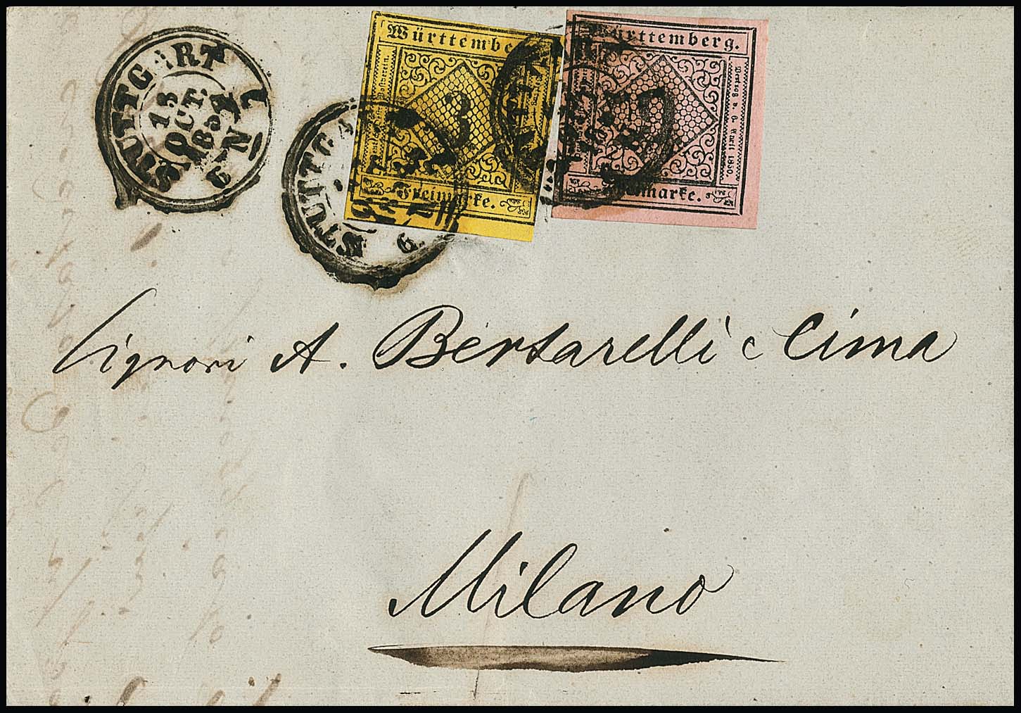 3 Kr. schw./gelb (ber.) und Prachtstück 9 Kr. schw./rosa auf Brief von Stuttgart 1854 nach Mailand, sign. Thoma
