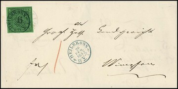 6 Kr. schw./grün, breitrandig, mit blauem K2 "Heilbronn" auf doppelt verwendetem Luxusbrief nach Wimpfen (Taxisgebiet), vorderseitig Bestellgeldkreuzer "1" in Rötel
