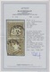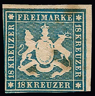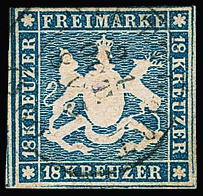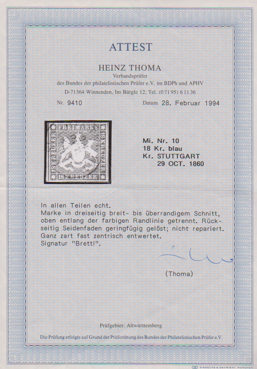 18 Kr. blau, dreiseitig breitrandiges Prachtstück, oben entlang der Randlinie geschnitten, zentr. K2 "Stuttgart", rs. Seidenfaden gering gelöst, sign. Brettl und Attest Thoma. Mi. 1700,-