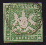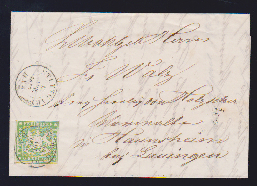 6 Kr. gelblichgrün, teils überrandig, auf Kabinettbrief mit K2 "Stuttgart", sign. Thoma