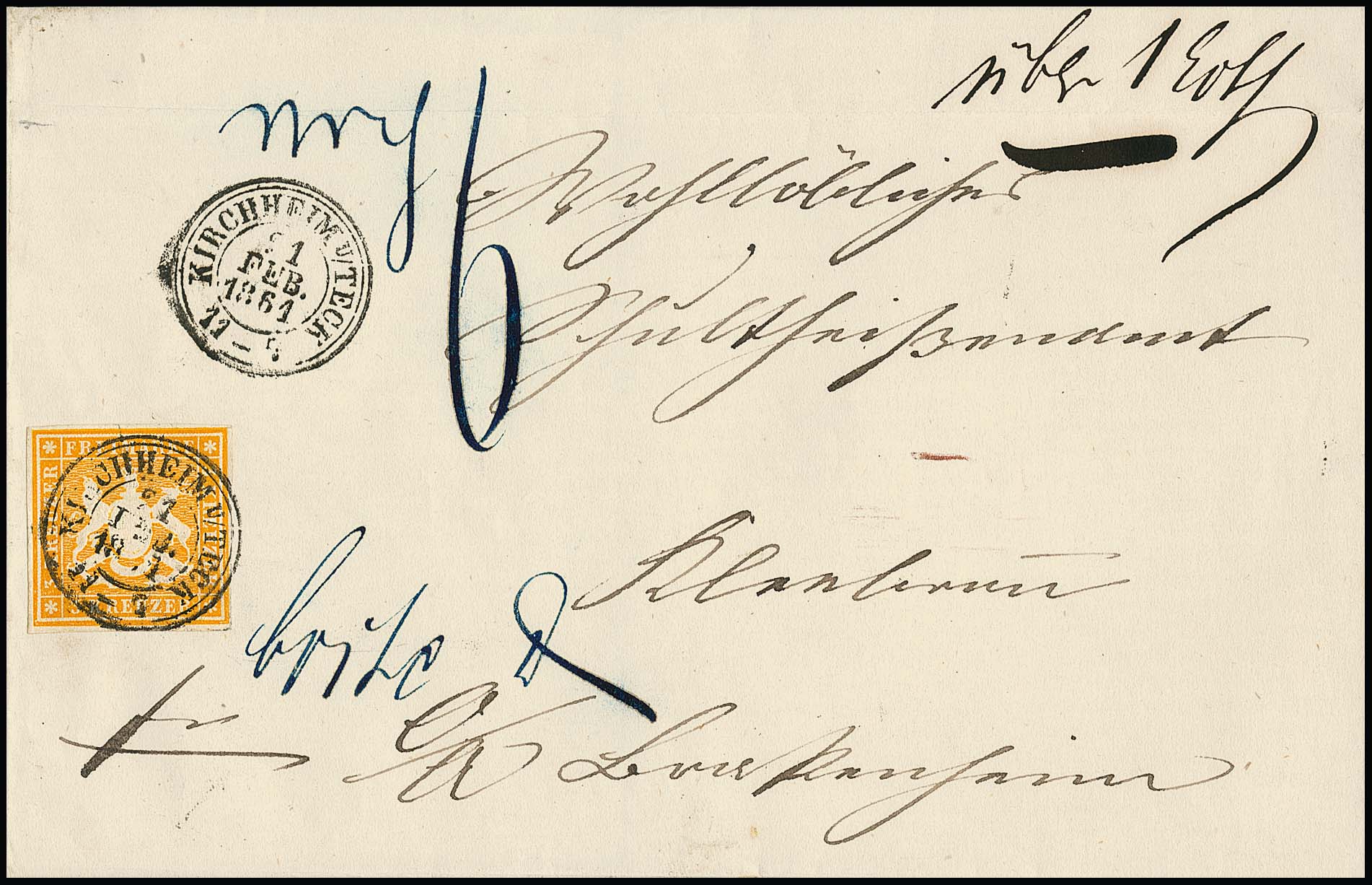 3 Kr. orange auf nachtax. Kabinettbrief mit K2 "Kirchheim u. Teck" 1861, hs. "über 1 Loth", "boite" und "noch 6"