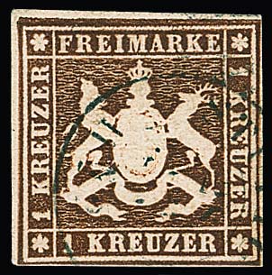 1 Kr. tiefdunkelbraun, überrandiges Kabinettstück (vom rechten oberen Eckrand stammend) mit Stb. "Grossbottwar", Fotoexp. Heinrich. Mi. 800,-