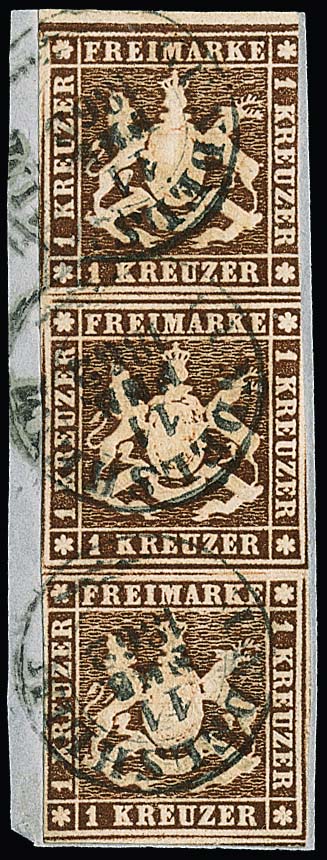 1 Kr. tiefdunkelbraun, von dieser Nuance seltener senkrechter Oberrand-Dreierstreifen im guten, ausgabetypischen Schnitt auf Briefstück mit K2 "Gundelsheim", sign. Thoma. Mi. 3800,-