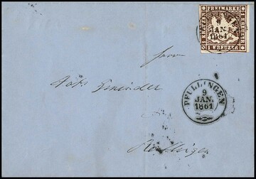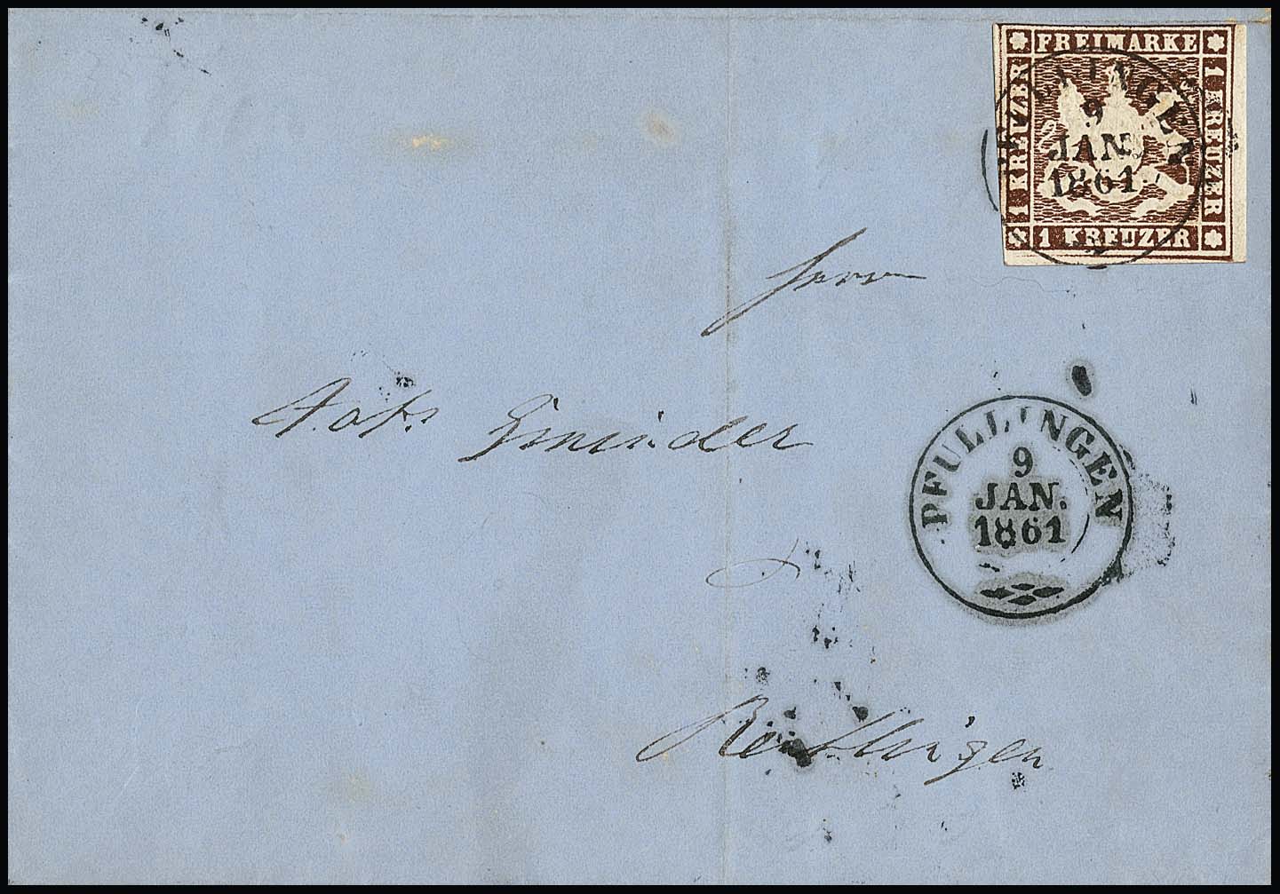 1 Kr. tiefdunkelbraun, teils angeschnitten, vom Rand, als gute Einzelfrankatur dieser seltenen Nuance auf gefaltetem Brief mit K2 "Pfullingen" 1861 nach Reutlingen, sign. Thoma. Mi. 2000,-