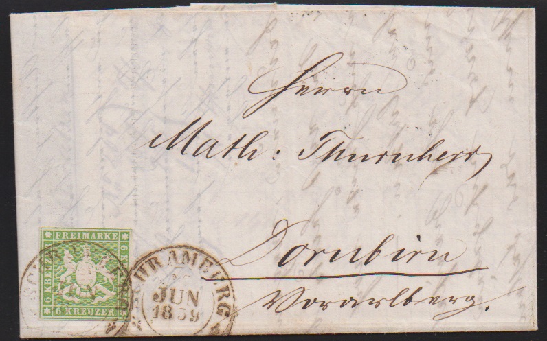 6 Kr. grün, hervorragend gut geschnitten, auf Kabinettbrief (innen dekorativer Briefbogen einer Porzellan- und Steingutfabrik) mit Stb. "Schramberg" 1859 nach Dornbirn