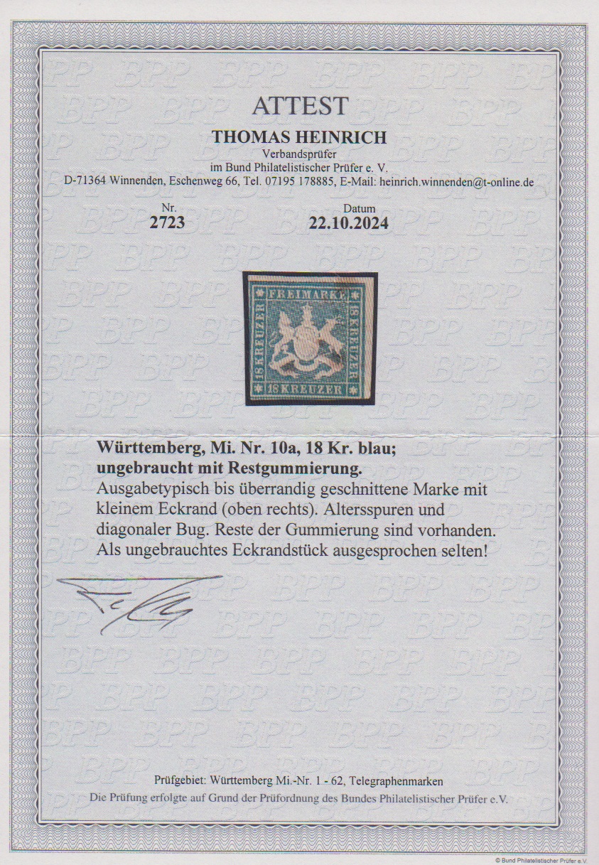 18 Kr. blau, von dieser Marke seltene ungebrauchte rechte obere Bogenecke mit Teilgummi, etwas fleckig und diagonale Bugspur, Bogenränder oben und rechts, Mi. 5000,-, Attest Heinrich "als ungebrauchtes Eckrandstück ausgesprochen selten!"