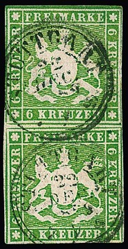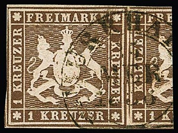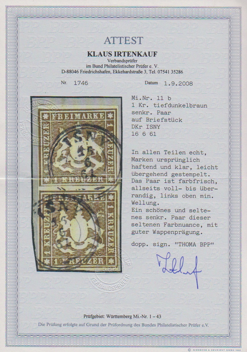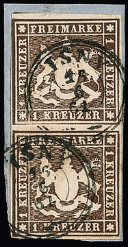 1 Kr. tiefdunkelbraun, sehr seltenes senkrechtes Paar, allseits voll- bis breitrandig, auf Prachtbriefstück mit K2 "Isny", eine kleine Eckwellung ohne Belang. Sign. Thoma und Attest Irtenkauf. Mi. 2200,-