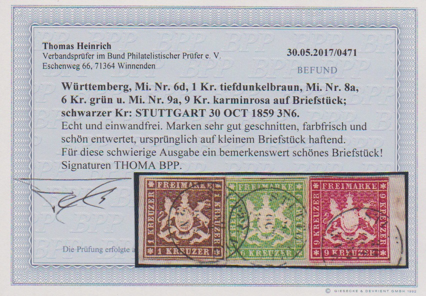 1 Kr. tiefdunkelbraun, 6 Kr. grün und 9 Kr. karminrosa, je gut geschnitten, auf Kabinettbriefstück mit K2 "Stuttgart", sign. Thoma und Fotoexp. Heinrich "einwandfrei"
