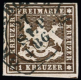 1 Kr. sepia, weit überrandiges Kabinettstück (rechts 1/3 Nebenmarke!) mit Stb. "Murrhardt", sign. Heinrich. Mi. 450,-