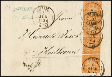 3 Kr. dunkelorange per vier in gutem, ausgabetypischem Schnitt auf ursprünglichem Prachtbrief mit K2 "Ulm" 1858 nach Heilbronn
