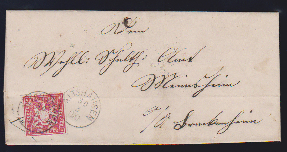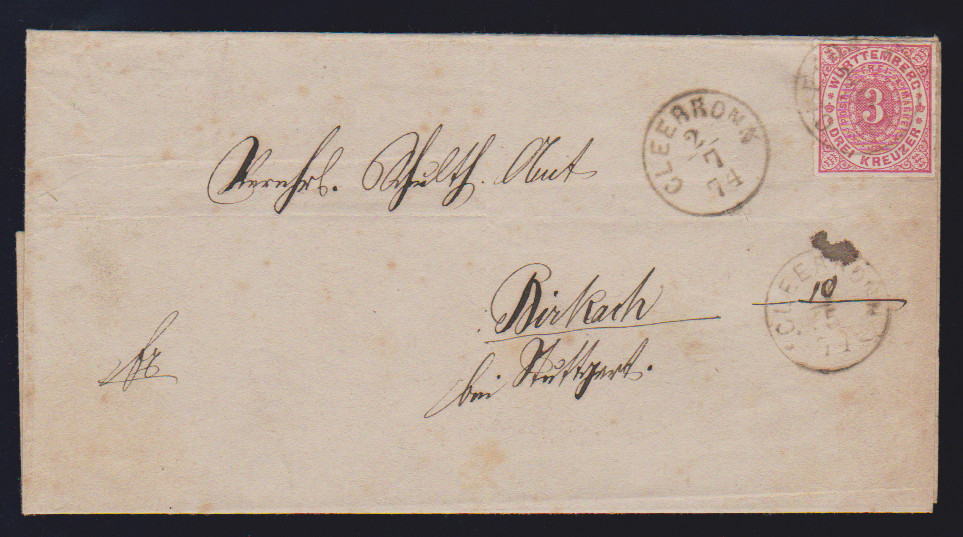 "Cleebronn", besserer K1 klar auf etwas unfrischem Brief mit 3 Kr. rosa