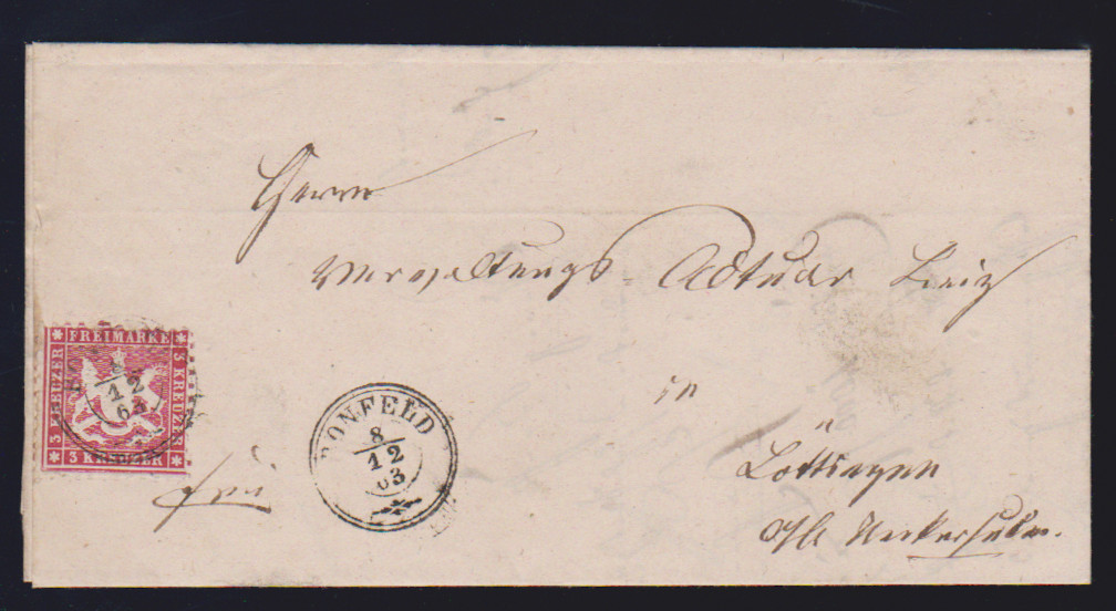 "Bonfeld", K2 auf doppelt verwendetem Brief mit normal gez. 3 Kr. karmin, innen K2 "Gundelsheim"