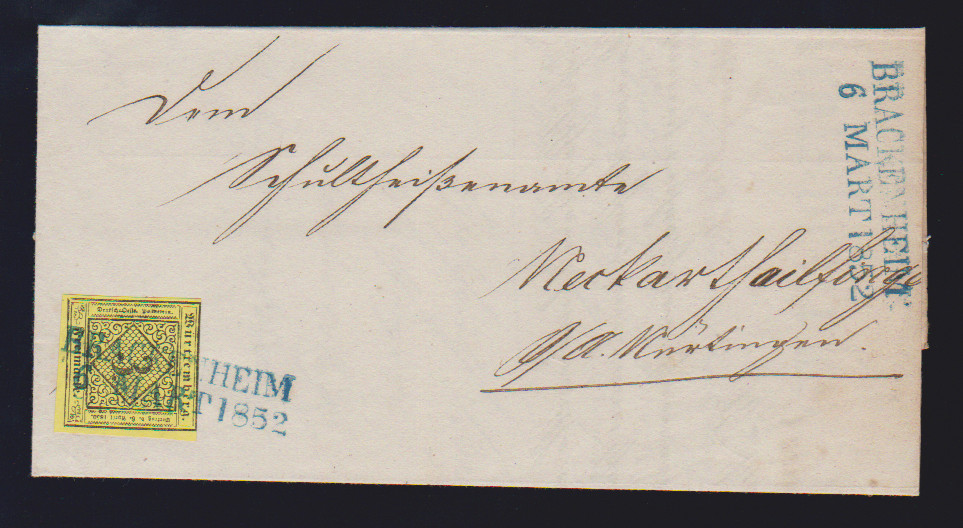 "Brackenheim", blauer L2 voll auf Brief 3 Kr. schw./gelb (etwas Randlinienschnitt)