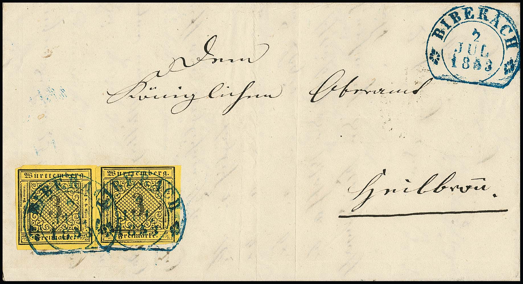 "Biberach", blauer Stb. klar 1853 auf gefaltetem Brief mit zwei Kabinettstücken 3 Kr. schw./gelb