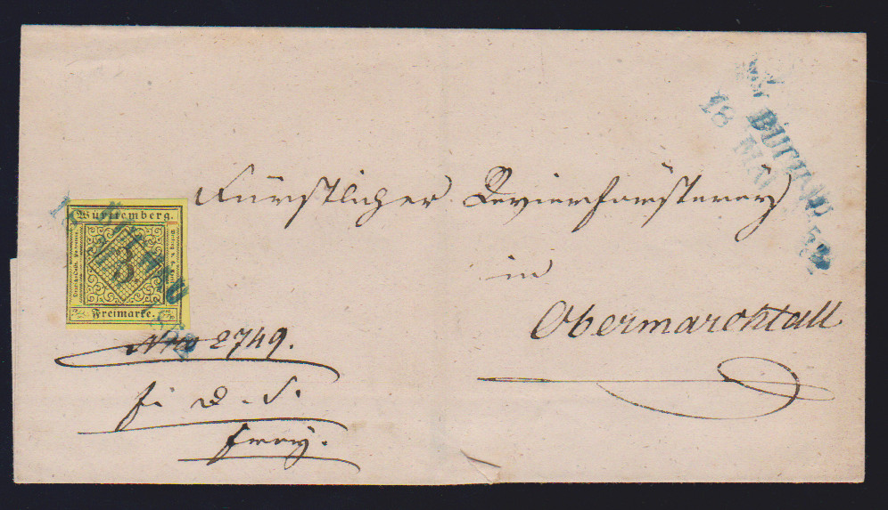 "Buchau", blauer L2 auf Brief 3 Kr. schw./gelb (leicht berührt) nach Obermarchthal, Hb. 450,-