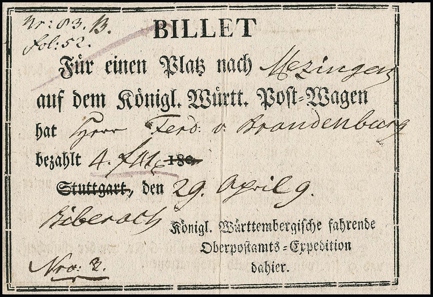 "Biberach", handschriftlich auf Vordruck "Stuttgart", 1809, sehr seltenes frühes Post-Reise-Billet für eine Fahrt mit dem Postwagen nach Metzingen ("königl. Württembergische fahrende Oberpostamts-Expedition dahier")