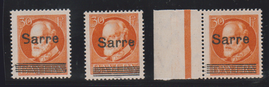 30 Pfg. Bayern-"Sarre", Aufdruckfehler FI, Hl und K (diese ein verkürzter Zahn, gut sign.) je postfrisch, sign. Burger. Mi. 215,-