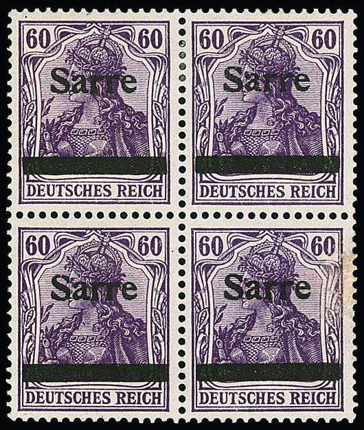 60 Pfg. rotlila, Aufdruck "Sarre" in Type I im ungebrauchten Viererblock, davon die rechte untere Marke Schürfungen, die drei anderen tadellos und alleine lose 1080,- Michel. Sign. Dub, Böcking und Attest Haslau (2025)