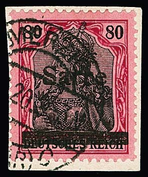 80 Pfg. "Sarre", tadelloses kleines Briefstück mit Aufdruck-Abart "a waagerecht gespalten" (Feld 38). Sign. Dub und Attest Braun. Mi. 1200,-