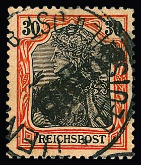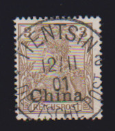 30 Pfg. "China"-Handstempel zentrisch gestempelt "Tientsin 30/1 01", rechts oben ein Zahn gering verkürzt bzw. zahnhell, sonst gut. Zahlreiche Signaturen, u.a. Bothe, Kosack, Thier, sowie neues Attest Jäschke-L. Mi. 6000,-