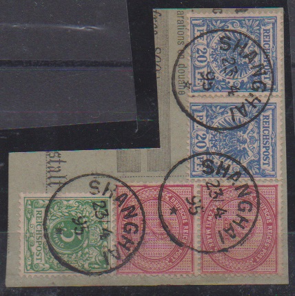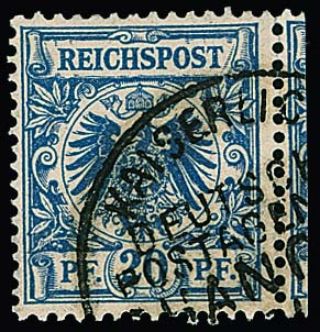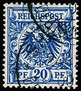 Vorläufer 20 Pfge. Krone-Adler in der sehr seltenen Farbe kobaltblau tadellos gestempelt "Shanghai", nur wenige Vorläufer-Marken dieser Nuance bekannt und im Michel mit "-.-" bewertet. Attestkopie Jäschke-L. für zerteiltes Paar