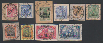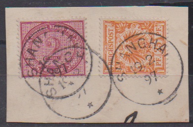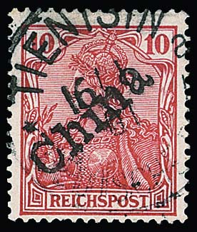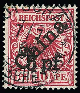 5 pf. a. 10 Pfg. mit diagonalem Aufdruck, sog. "Futschau-Provisorium", rechts unten repariert, aber von guter Gesamtwirkung mit zentrischem Ersttagsstempel. Seltene Marke, Fotoexp. R. Steuer. Mi. 7500,-