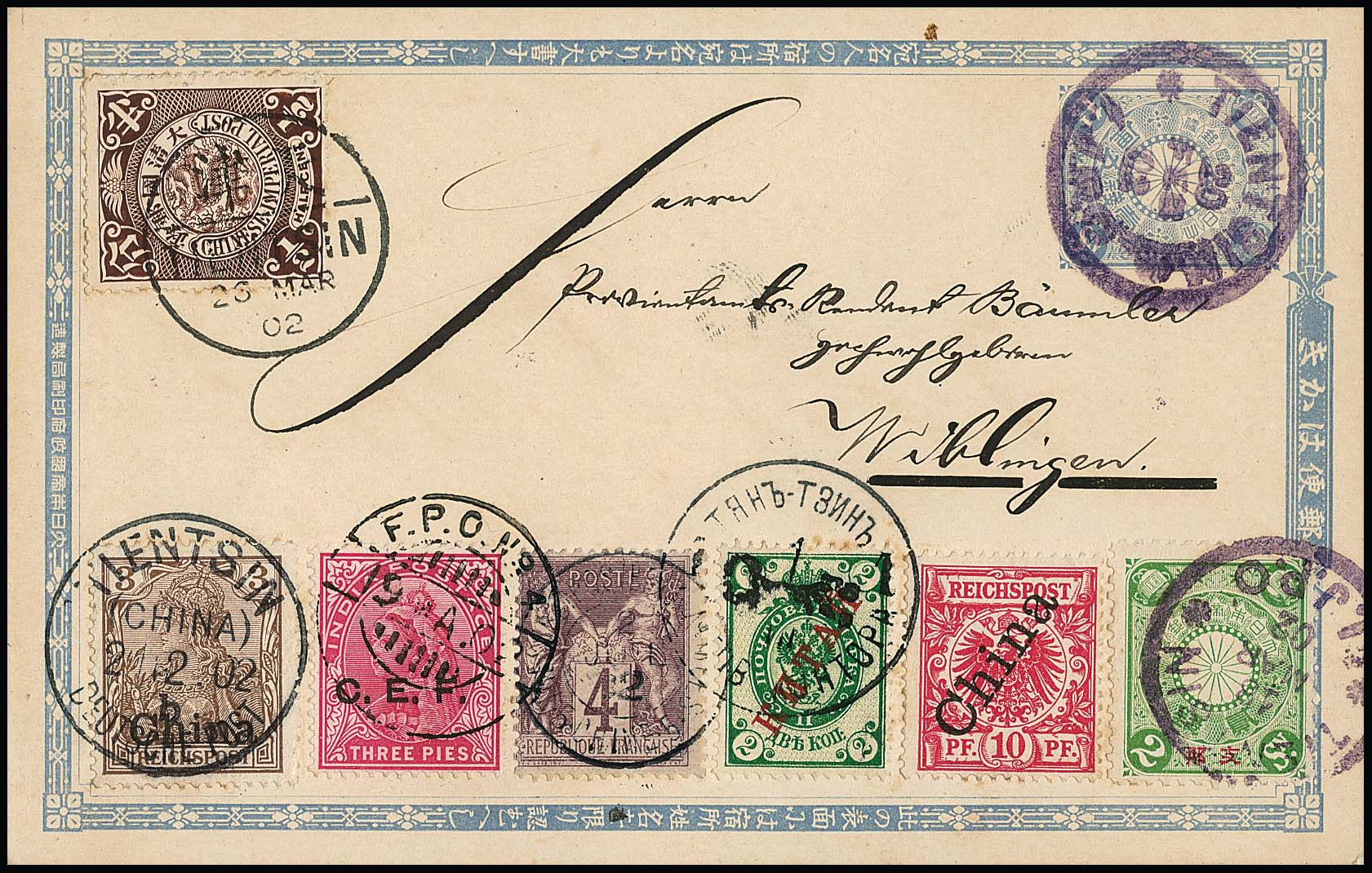 10 Pfg. Aufdruck nebst 3 Pfg. Germania und fünf Werten aus versch. Ländern auf japanischer Ganzsachenkarte von "Tientsin" 1902