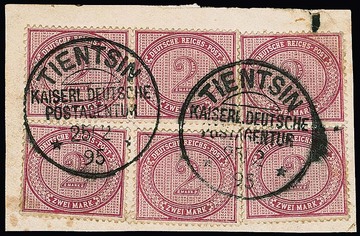 Vorläufer 2 Mk. rotkarmin per sechs (einmal min. Zf.) auf Briefstück mit klarem Stempel von Tientsin 1895, sign. Steuer