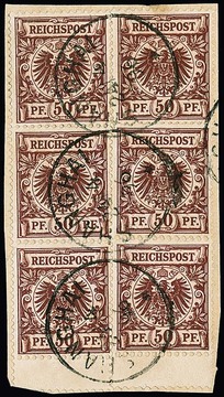 2 Pes. 50 C. a. 2 Mk. tadellos gestempelt "Fes (Marokko) 10.7.11", Marke mit Aufdruckfehler "langer Riß im M von Marocco". Dieser Plattenfehler war gestempelt bisher nicht bekannt und ist auch im Michel noch nicht bewertet, hier zudem mit seltener Abstempelung durch Stempel "Marokko", der nur noch gelegentlich vorkommt. Attest Jäschke-L. "eine sehr seltene Marke"