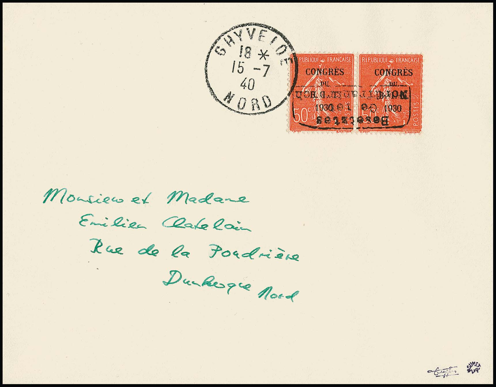 Dünkirchen 50 C. "Tagung des internationalen Arbeitsamtes" im Paar mit kopfstehendem senkrechtem Handstempelaufdruck (von oben nach unten) in Type I, auf portogerechtem Brief von Ghyvelde nach Dünkirchen, 5.7.40, sign. Dreyfus, Roumet und Attest Pieles. Mi. 1900,-