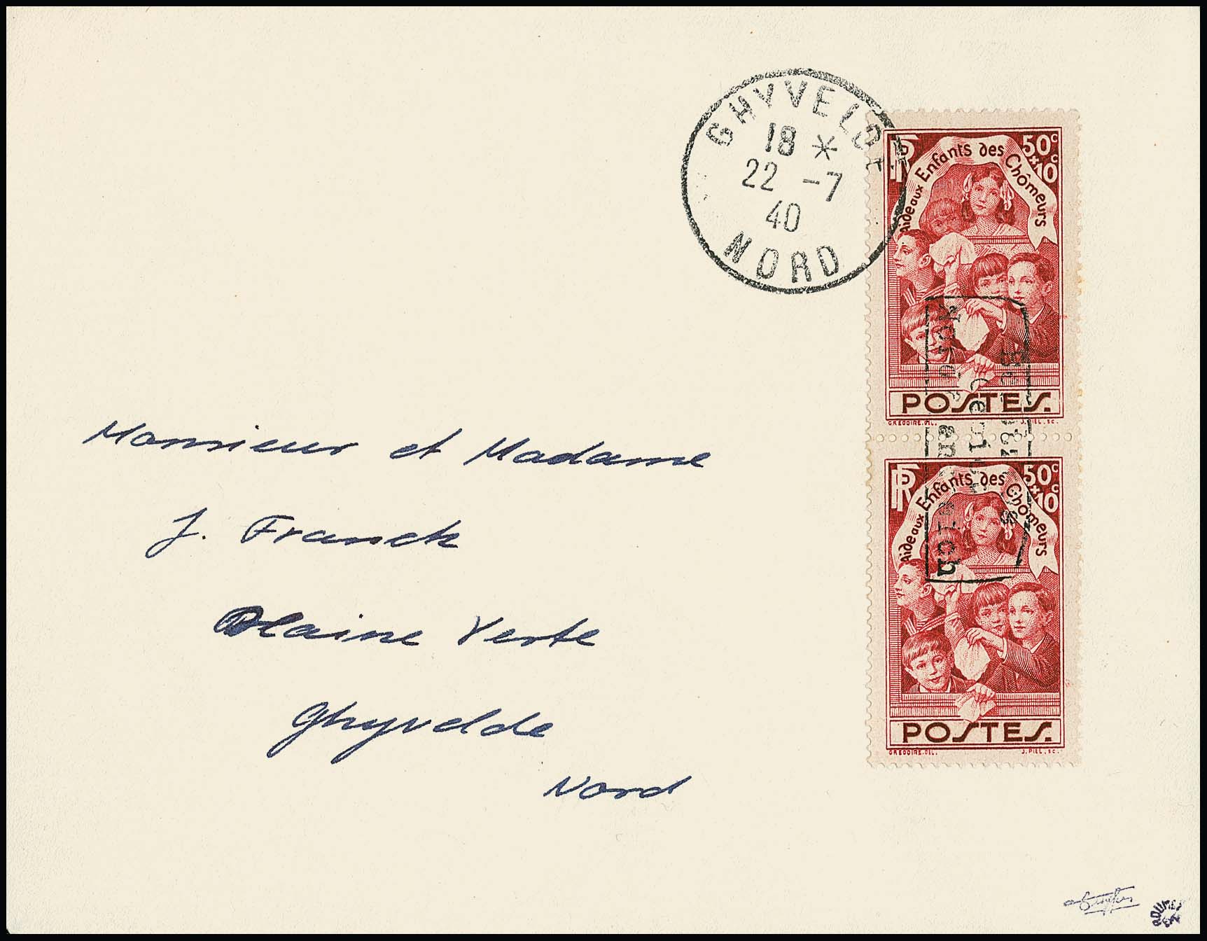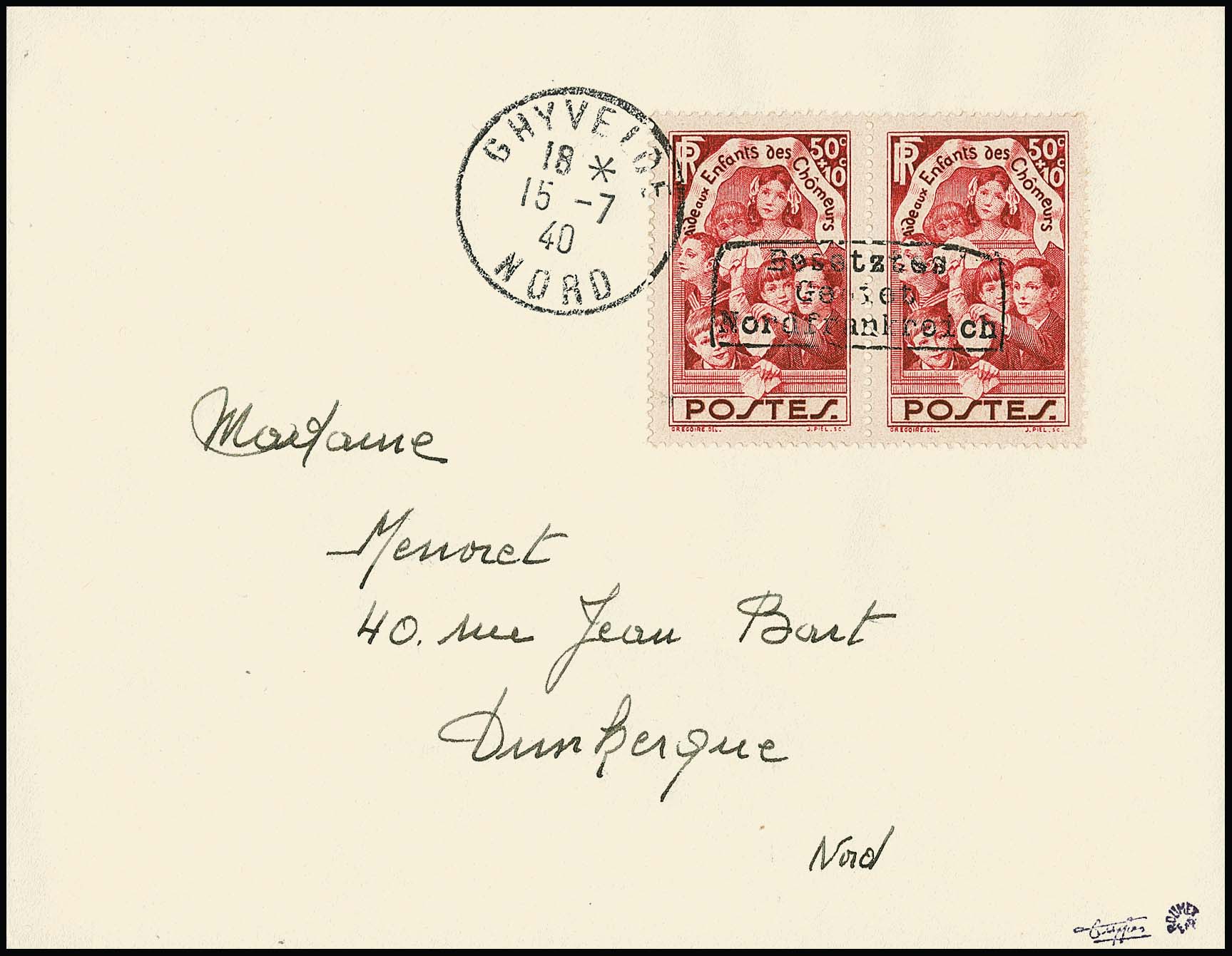 Dünkirchen 50 + 10 C. "Arbeitslosenkinder" im Paar mit Handstempelaufdruck in Type I (auf noch im Besitz des Publikums befindlichen Briefmarken) auf portogerechtem Brief aus Ghyvelde, 15.7.1940, nach Dünkirchen. Mehrfach-Frankaturen dieser Marke sind selten!. Sign. Dreyfus, Roumet und Attest Pieles. Mi. 1200,-