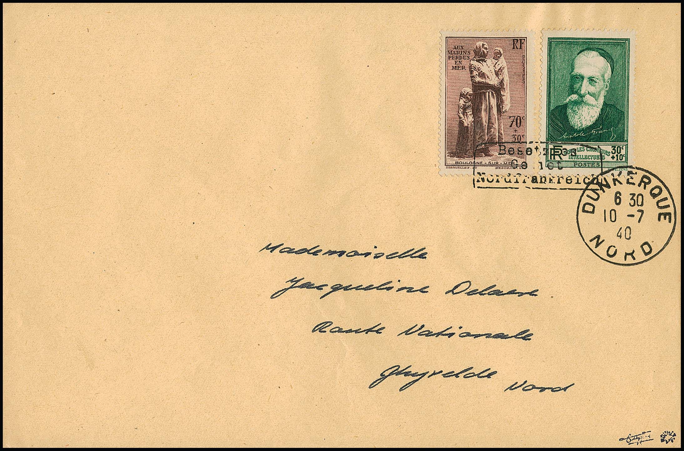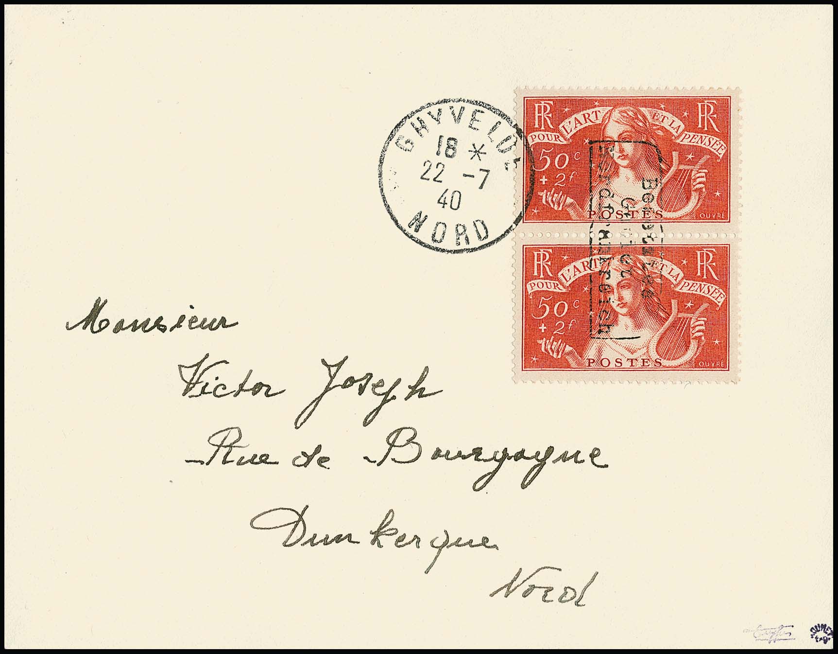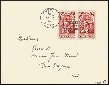 Dünkirchen 50 C. + 2 Fr. + 20 C. Musica im waagerechten Paar mit nur einem Handstempel in Type I (auf noch im Besitz des Publikums befindlichen Briefmarken) auf portogerechtem Brief von Ghyvelde, 7.7.1940, nach Dünkirchen. Sign. Dreyfus, Roumet und Attest Pieles. Mi. 1200,- +, seltene MeF!