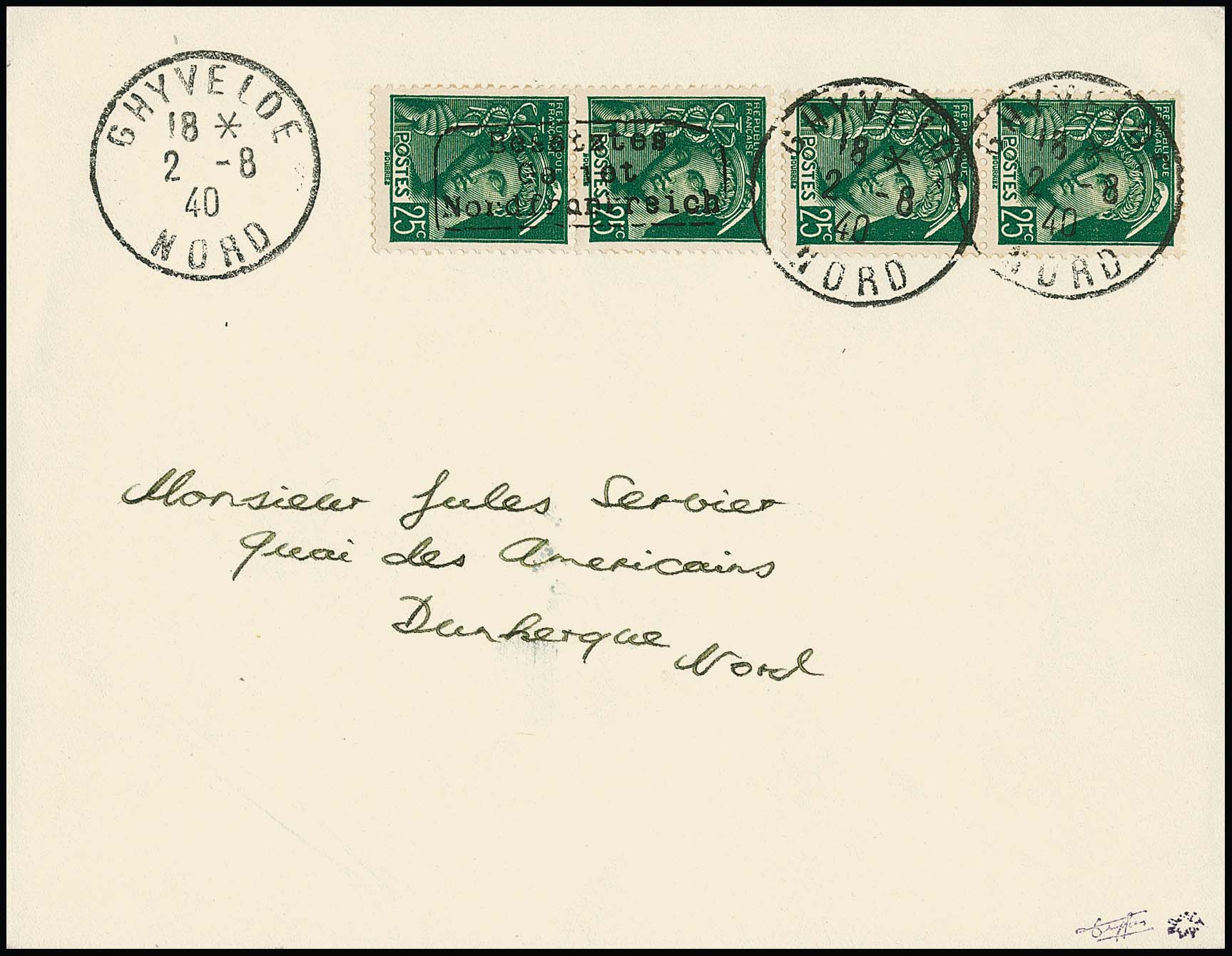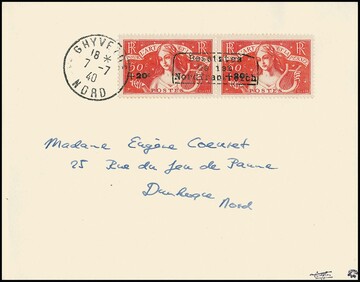 Dünkirchen 25 C. Merkur, zwei senkrechte Paare, eines mit, das andere ohne Aufdruck, auf portogerechtem Brief von Ghyvelde, 2.8.40, nach Dünkirchen. Sign. Dreyfus, Roumet, sowie Atteste Behr und Pieles ("einwandfrei ... Briefe wie der hier vorliegende mit der Frankaturvariante "Markenpaare mit und ohne Aufdruck" sind selten"). Michel nicht gelistet