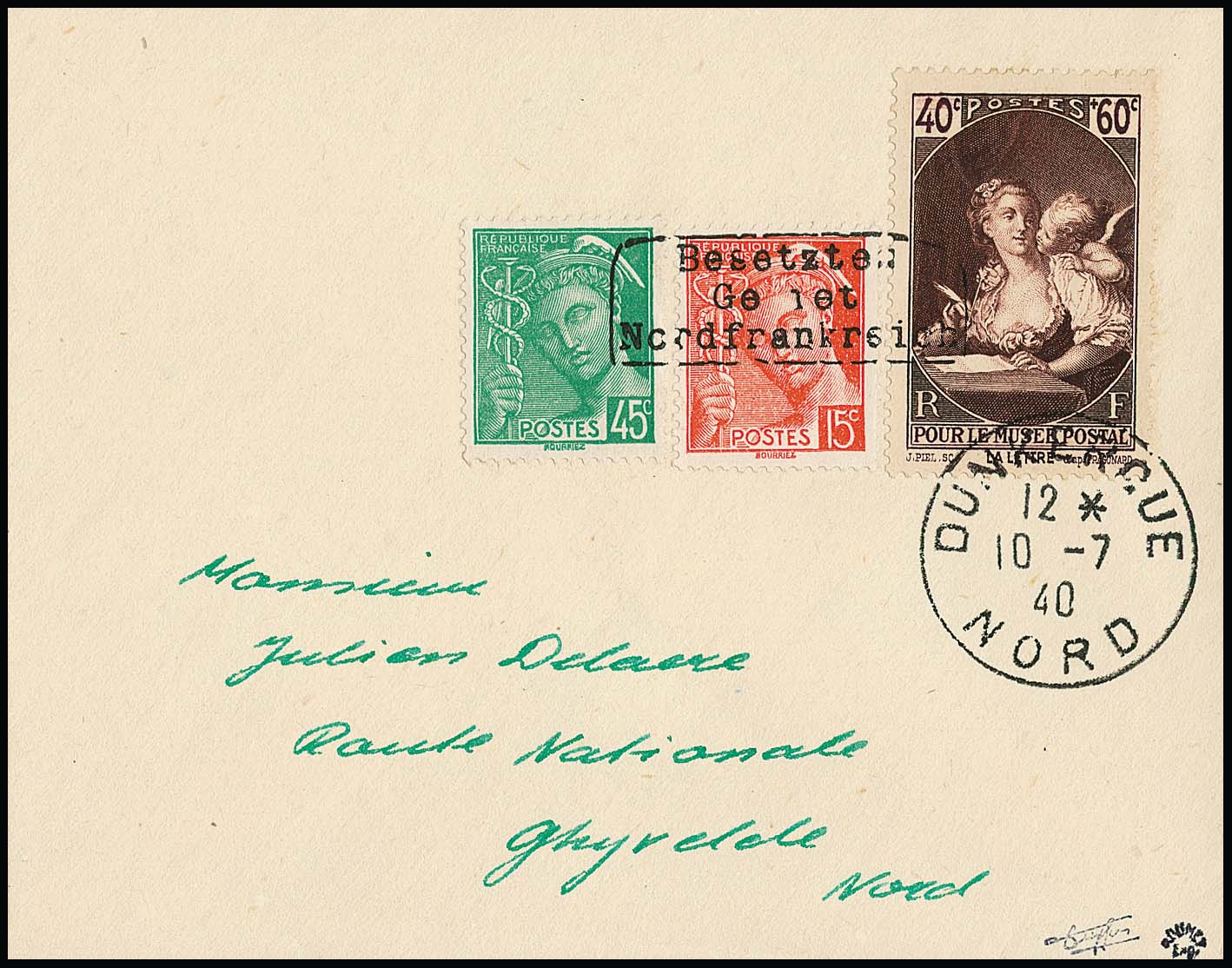 Dünkirchen 40 + 60 C. "Postmuseum Paris", nebst 15 und 45 C. Merkur, Handstempelaufdruck in Type I auf noch im Besitz des Publikums befindlichen Freimarken, auf hübschem kleinem portogerechtem Couvert von Dünkirchen, 10.7.40, nach Ghyvelde. Sign. Tust, Dreyfus, Roumet und Attest Pieles. Mi. 1200,-
