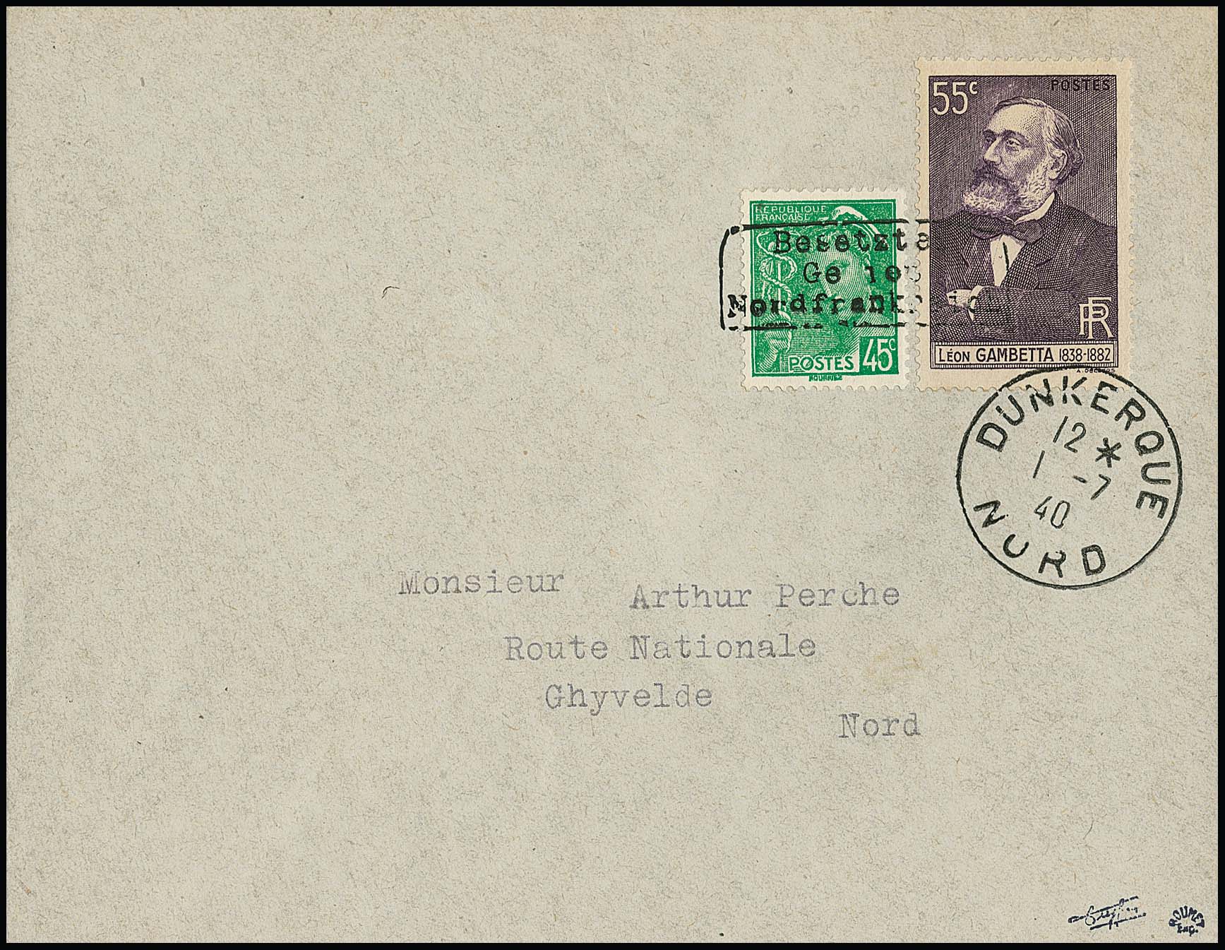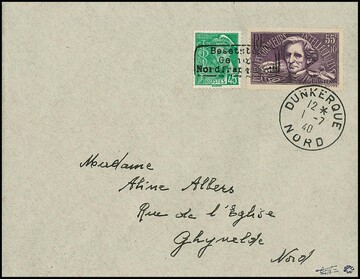 Dünkirchen 55 C. "100. Geburtstag von Léon Gambetta", nebst 45 C. Merkur, Handstempelaufdruck in Type I auf noch in Gebrauch des Publikums befindlichen Freimarken, auf portogerechtem Brief von Dünkirchen, Ersttag 1.7.40 (!), nach Ghyvelde. Sign. Tust, Dreyfus, Roumet und Attest Pieles. Mi. 1560,-