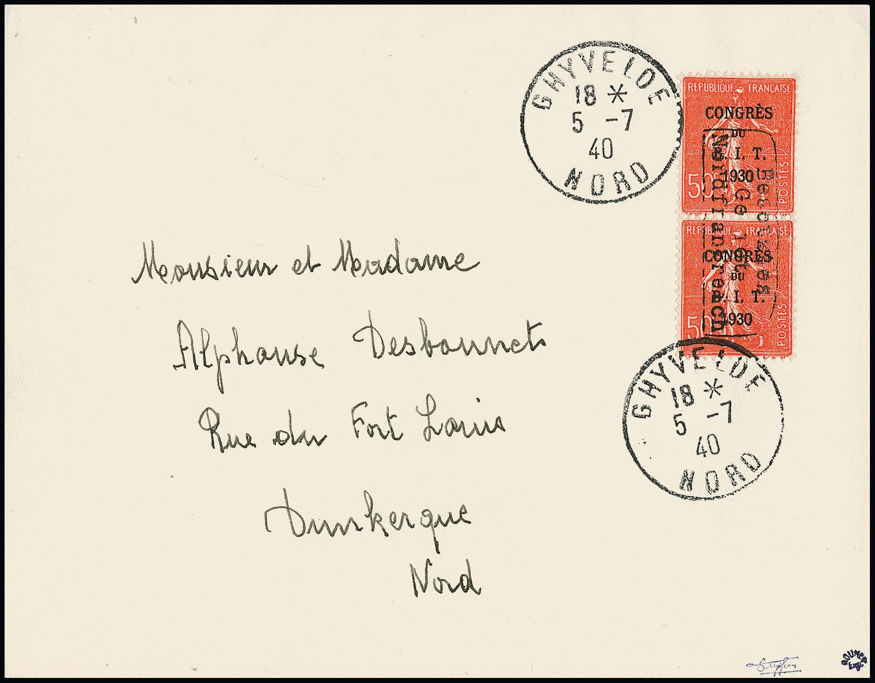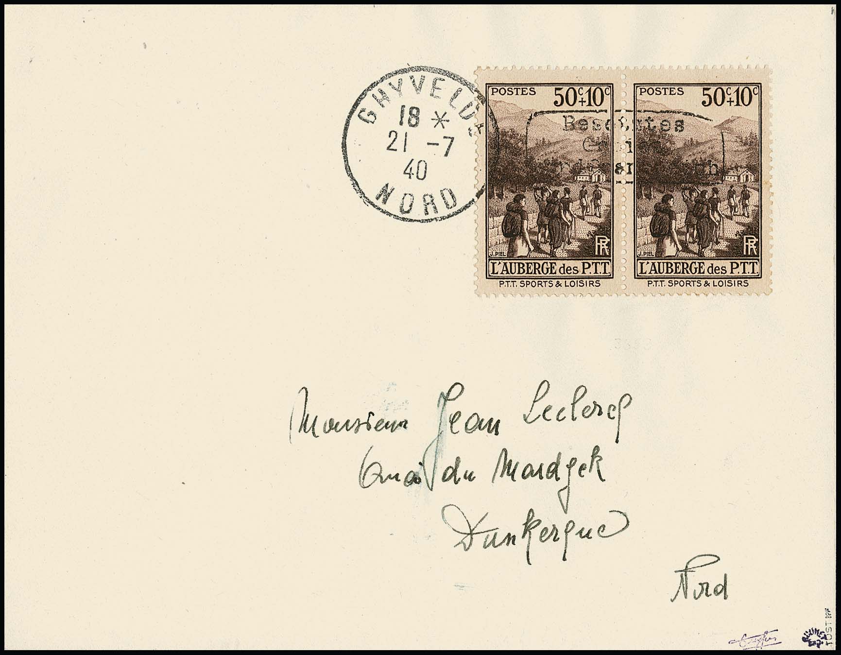 Dünkirchen 50 + 10 C. "Sport- und Freizeitgestaltung der Post- und Telegraphenbeamten" im Paar mit Handstempelaufdruck in Type I (auf noch im Besitz des Publikums befindlichen Briefmarken) auf portogerechtem Brief von Ghyvelde, 21.7.40, nach Dünkirchen, sign. Tust, Dreyfus, Roumet und Attest Pieles. Mi. 1200,-