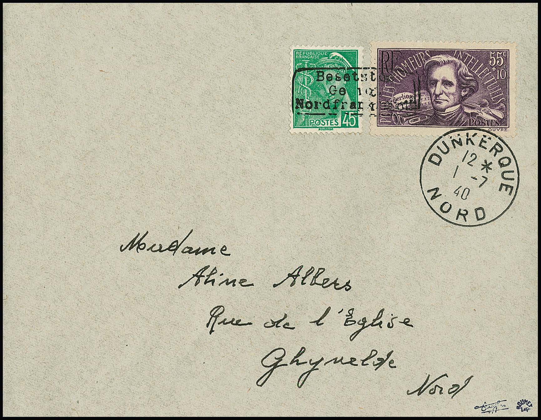 Dünkirchen, 55 + 10 C. Hector Berlioz, nebst 45 C. Merkur, Handstempel in Type I auf noch im Besitz des Publikums befindlichen Freimarken, auf portogerechtem Brief aus Dünkirchen vom Ersttag, 1.7.1940. Sign. Dreyfus, Roumet und Attest Pieles. Mi. 1560,-