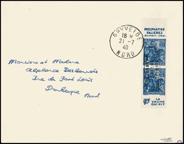 Dünkirchen 50 C. blau, "Befreiung von Orleans", senkrechtes Paar aus Markenheftchen mit Reklamefeldern oben und unten, mit Handstempel in Type I, auf portogerechtem Couvert von Ghyvelde, 21.7.1940, nach Dünkirchen. Sign. Dreyfus, Roumet und Attest Pieles "Mit dem Handstempel versehene Marken aus Markenheftchen gehören zu den Seltenheiten der Dünkirchen-Ausgaben ... Einwandfrei". Mi. 3000,-