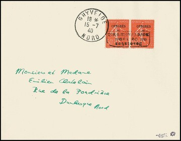 Dünkirchen 50 C. "Tagung des Arbeitsamtes" im Paar mit kopfstehendem waagerechtem Handstempelaufdruck in Type I auf portogerechtem Brief aus Ghyvelde, 15.7.1940. Mehrfach-Frankaturen dieser Aufdruck-Abart auf noch im Besitz des Publikums befindlichen Freimarken sind sehr selten! Sign. Roumet, Dreyfus und Attest Pieles. Mi. 2700,-
