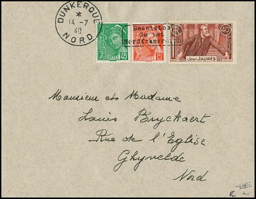 Dünkirchen 45 und 15 C. Merkur, sowie 40 C. "Todestag von J. Jaurès", Handstempelaufdruck in Type I auf noch im Besitz des Publikums befindlichen Freimarken, auf portogerechtem Brief von Dünkirchen, 14.7.1940. Sign. Dreyfus, Roumet und Attest Pieles. Mi. 1400,-