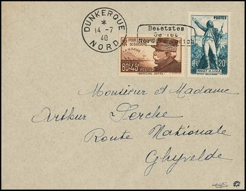 Dünkirchen 20 C. "Todestag de Lisle" und 50 + 45 C. "Marschall Joffre", Handstempelaufdruck in Type I auf noch im Besitz des Publikums befindlichen Freimarken, auf portogerechtem Brief von Dünkirchen, 14.7.1940, nach Ghyvelde. Sign. Dreyfus, Roumet und Attest Pieles. Mi. 1400,-