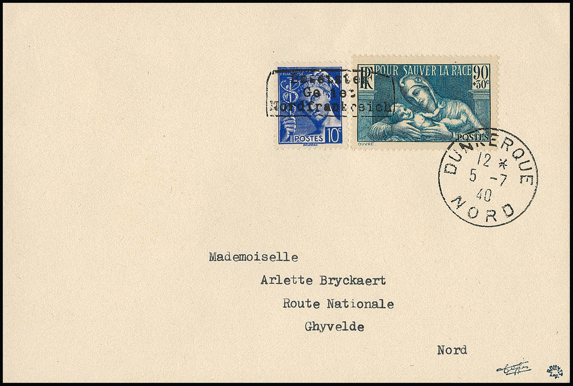 Dünkirchen 10 C. Merkur und 90 + 35 C. Gesundheitshilfe, Handstempelaufdruck in Type I auf noch im Besitz des Publikums befindlichen Freimarken, auf Briefvorderseite aus Dünkirchen, 5.7.1940. Michel lose gestempelt 600,- ++. Sign. Dreyfus, Roumet und Attest Pieles