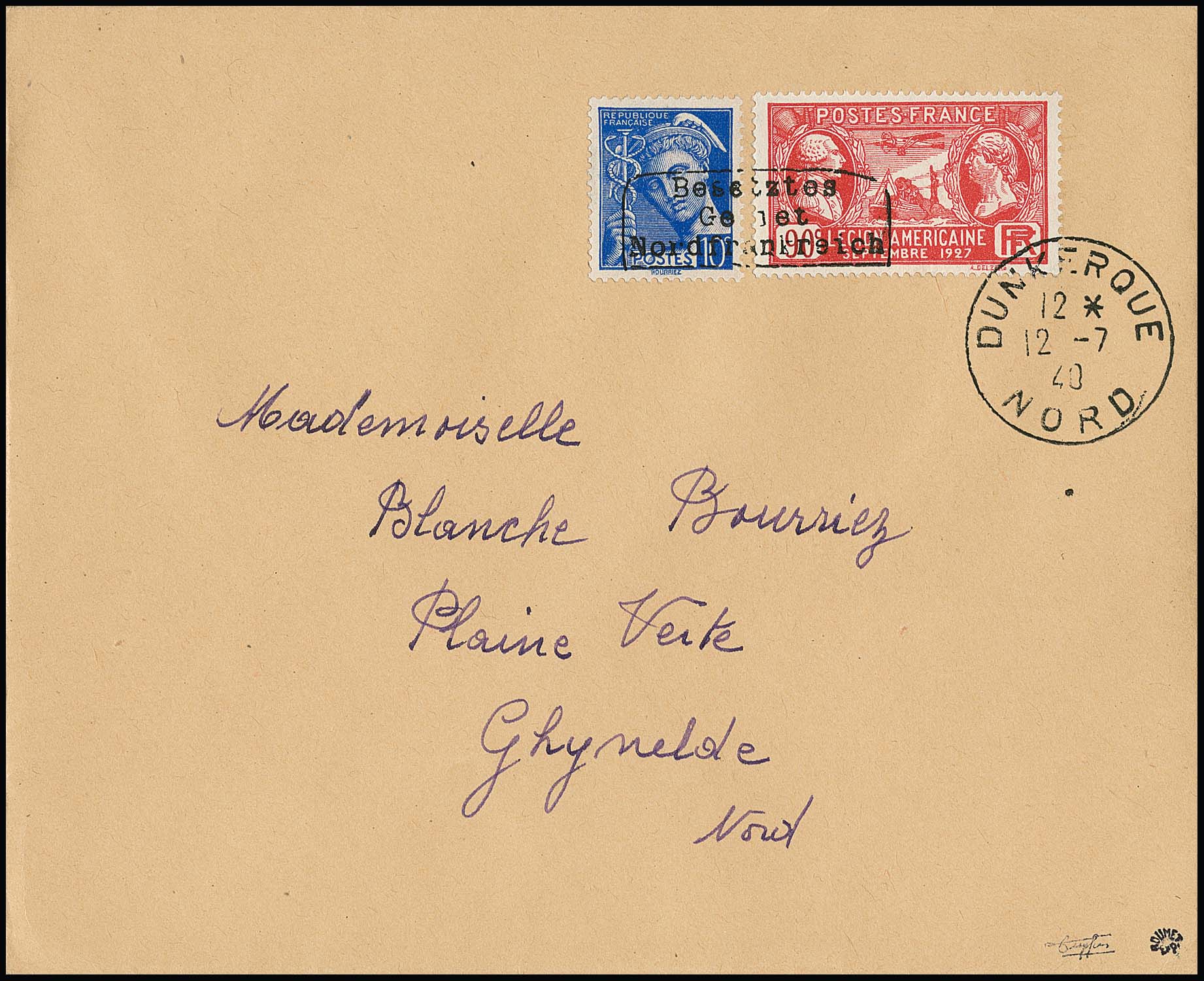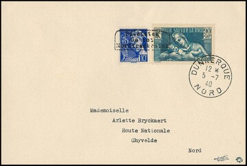 Dünkirchen 10 C. Merkur und 90 C. "Kongreß der Amerikanischen Legion", Handstempelaufdruck in Type I auf noch im Besitz des Publikums befindlichen Marken, auf portogerechtem Brief von Dünkirchen, 12.7.1940, nach Ghyvelde. Sign. Dreyfus, Roumet und Attest Pieles. Mi. 1000,-