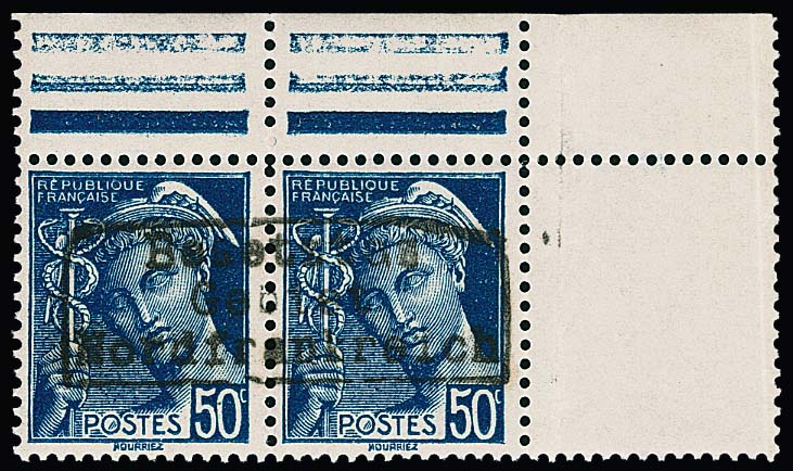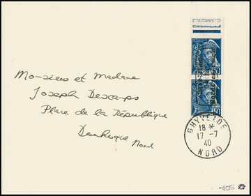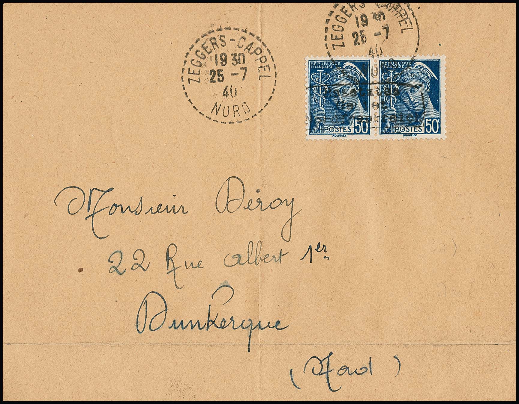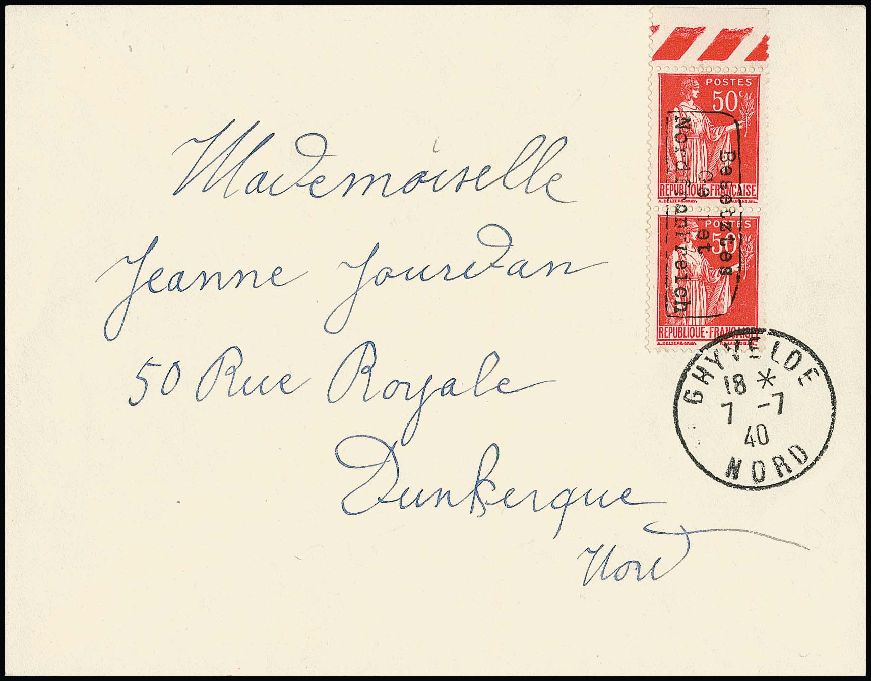 Dünkirchen, 50 C. Merkur im Oberrandpaar mit Handstempel in Type I auf portoger. Brief von Ghyvelde, 17.7.1940, nach Dünkirchen. Sign. Roumet, Dreyfus und Attest Pieles. Mi. 600,-