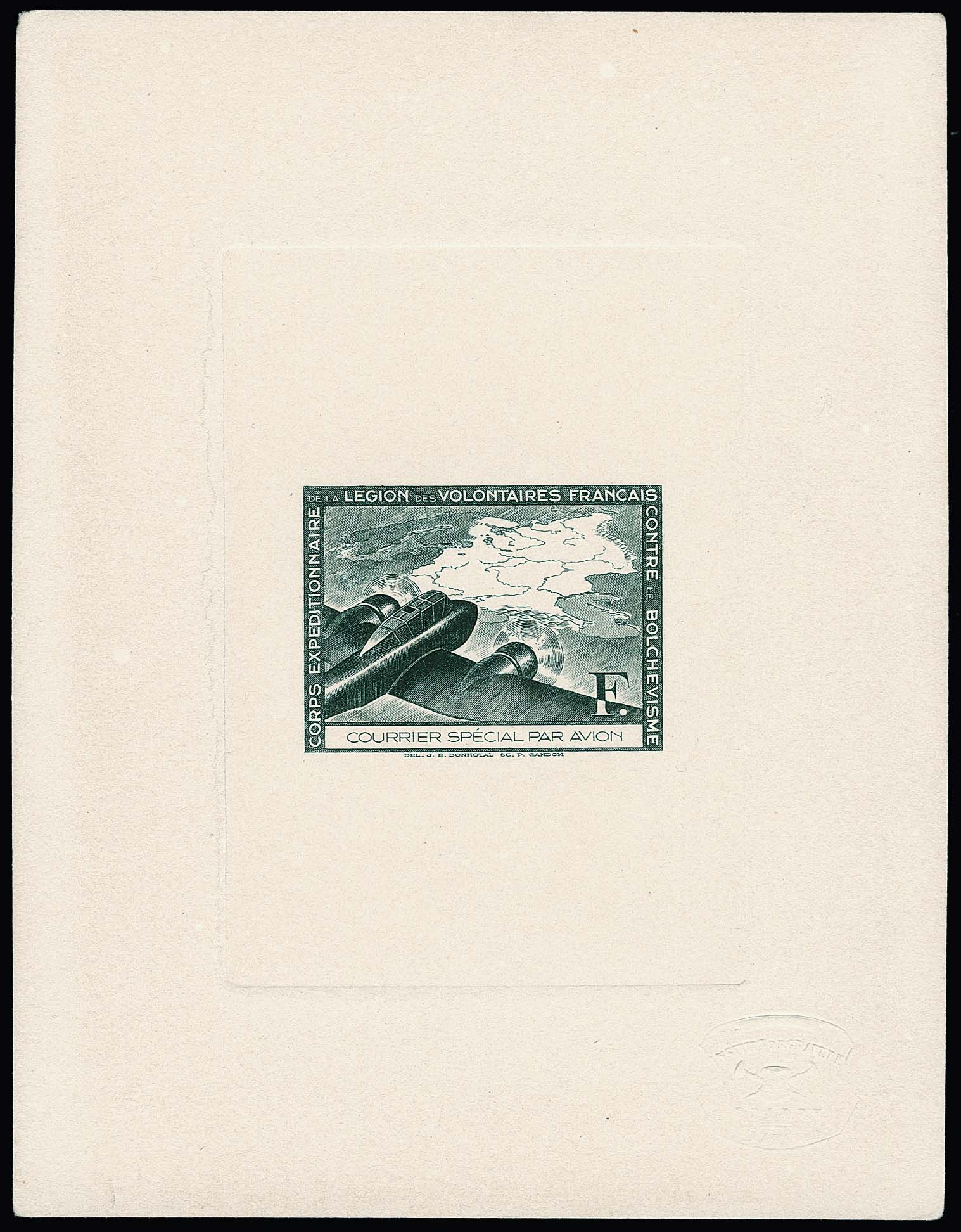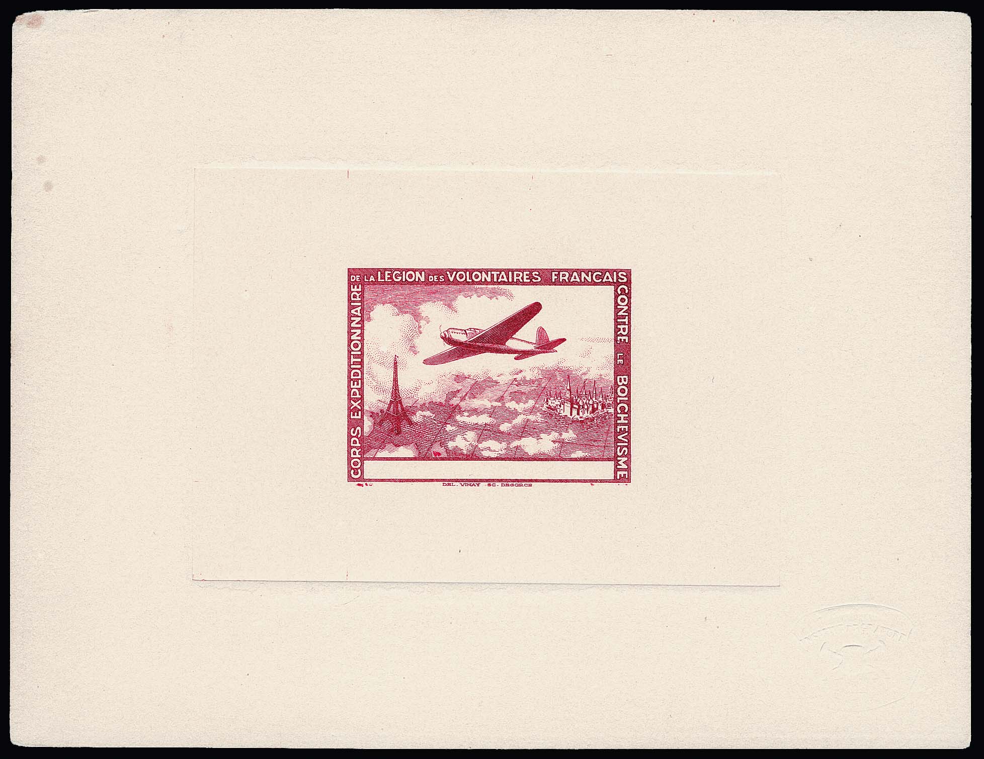 Legionsausgaben, Flugpostvignetten je im Ministerblock-Einzelabzug auf Büttenkarton, Nr. II in der Variante mit Inschrift "COURRIER SPÉCIAL PAR AVION" in Markenfarbe (sehr selten!), Nr. III ohne Inschrift, beide mit Prägesiegel, letzterer typisch leicht bestoßene Eckchen und kleine Randfleckchen. Diese Ministerblocks wurden nur in einer kleinen Auflage hergestellt und sind sehr selten! Atteste Pieles