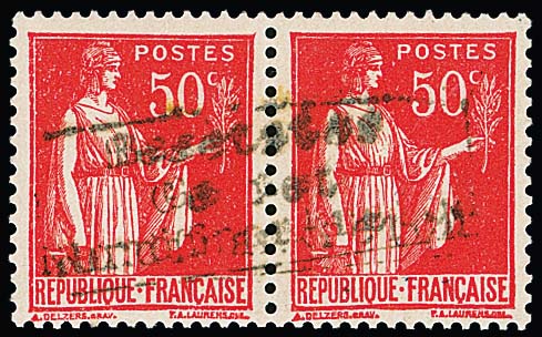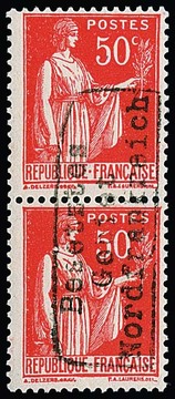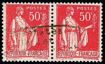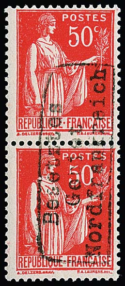 Dünkirchen 50 C. Friedensallegorie, Urmarke Type I, im senkrechten postfrischen Paar mit Handstempelaufdruck in Type II, Attest Pieles. Mi. 350,-