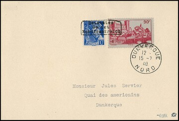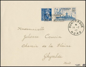 Dünkirchen 10 C. Merkur und 90 C. "Schlachtschiff Clemenceau", Handstempelaufdruck in Type I auf noch im Besitz des Publikums befindlichen Freimarken, auf portogerechtem Brief von Dünkirchen, 14.7.1940, nach Ghyvelde. Sign. Dreyfus, Roumet und Attest Pieles. Mi. 800,- +