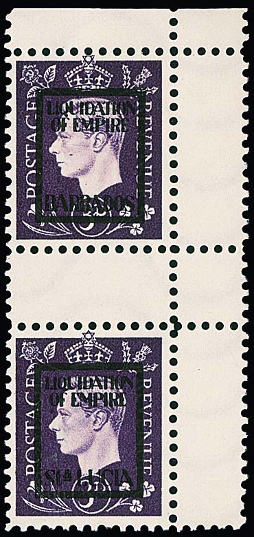 3 P. Georg, Zusammendruckpaar "Barbados" und "Sta. Lucia" im wie verausgabt ungebrauchtem Paar vom rechten Bogenrand, Mi. lose 280,- +