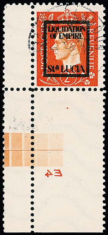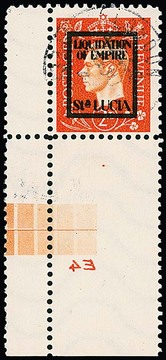 2 P., "St. Lucia", seltenes gestempeltes Eckrandstück mit Platten-Nr. "E4" spiegelverkehrt. Von den etwa 400 hergestellten Exemplaren der Gesamtauflage existieren nur wenige mit Platten-Nummer